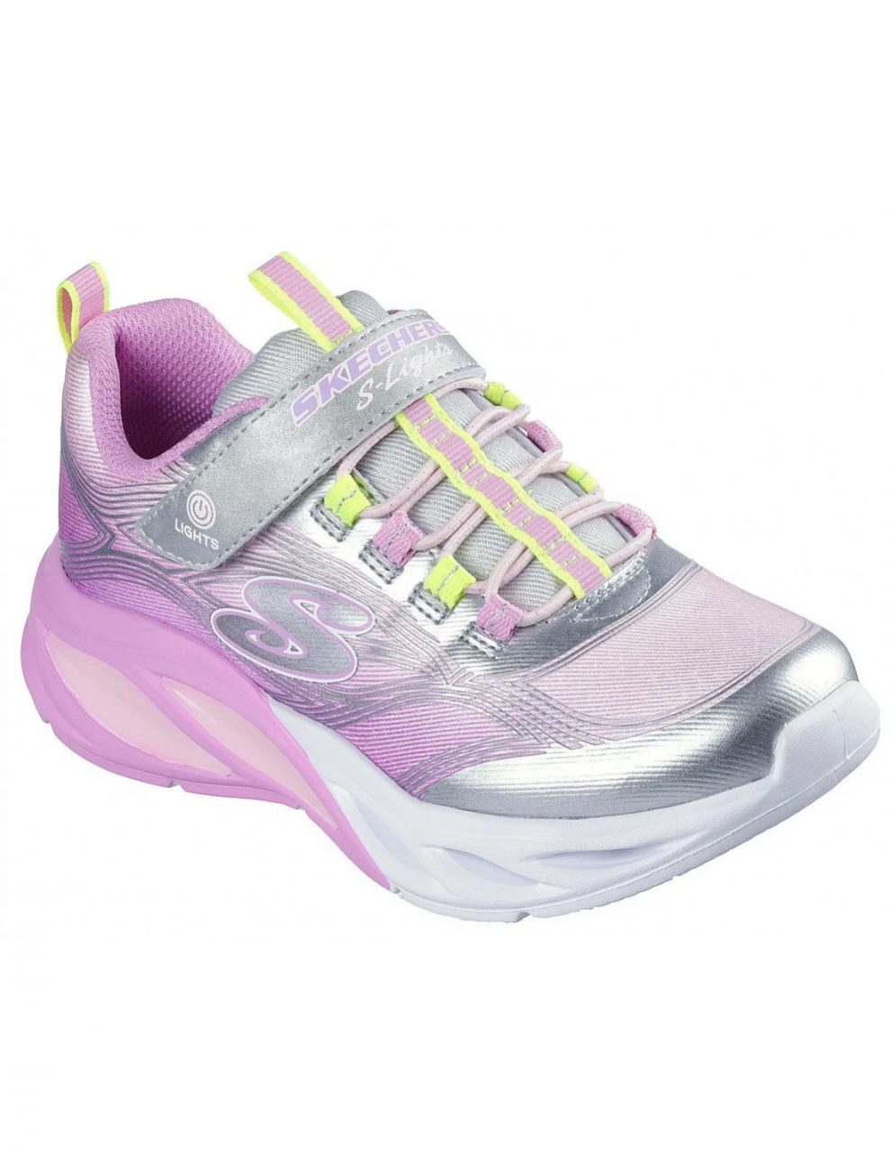 Ilumina tu día a día con las Skechers S-Lights®: Cosmic Glow. Este diseño activo con luces de colores cuenta con una parte superior sintética y con malla brillante degradada con cordones elásticos, una correa ajustable en el empeine, una media suela con buena amortiguación y luces que se activan al caminar.